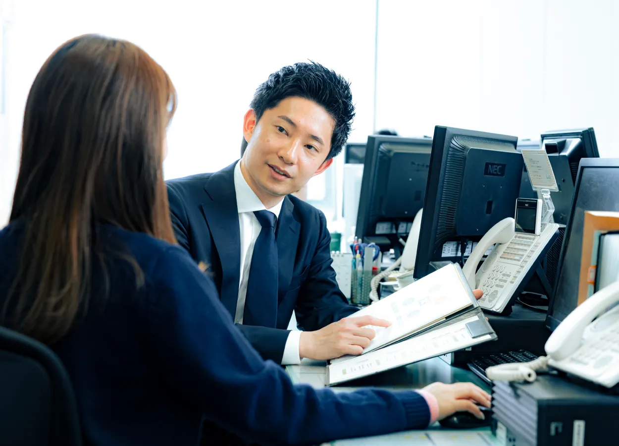 当社は銀行系仲介会社ですが、銀行からの紹介案件のみを扱うのではなく、約半分は独自で営業を行っている点が大きな特徴です。営業は新規開拓から契約まで、不動産取引のスキルをマルチタスクで身につけます。そのネットワークにはハウスメーカーの営業担当者をはじめ、弁護士や税理士など士業の方々もいます。また、契約書はもちろん、お客さまへの提出書類に関しては、何人もの社員が目を通して確認し、お客さまのご納得のいく取引につなげていく。良い意味で“細かすぎる”社風が根付き、あらゆるリスクを考え行動する。そんななかで、ハングリーに成長できる環境があります。